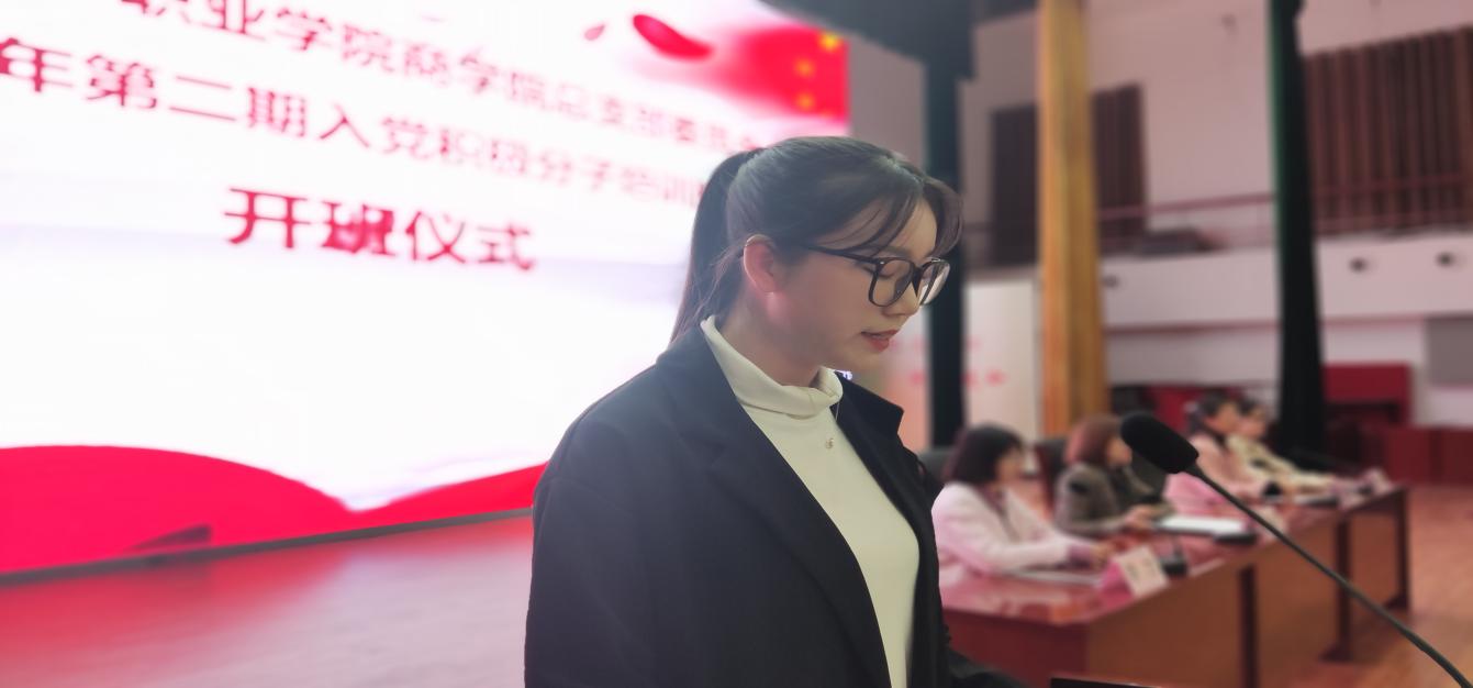 开班仪式在庄严的国歌声中拉开序幕。营销2003班杨鹏毅同学作为入党积极分子代表发言。她表示十分荣幸能够参加本次培训班,要充分利用这次学习机会,认真学习党的先进理论与光辉历程,要把共产党人这种全心全意为人民服务的理念融入到学习生活中去,积极向党组织靠拢,争取早日成为党组织中的一员。