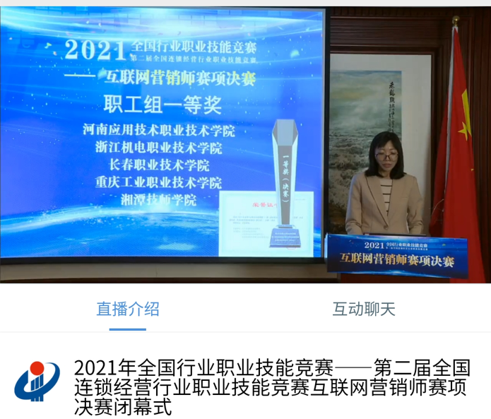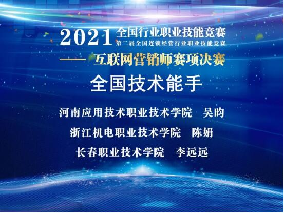 11月13日,2021年全国行业职业技能竞赛——第二届全国连锁经营行业职业技能竞赛首届互联网营销师赛项全国总决赛圆满落幕。我院Beat365官方网站教师吴昀以总分第一名的成绩获得职工组一等奖,根据竞赛规程,职工组决赛前3名的选手,在报请人力资源和社会保障部核准后,将授予“全国技术能手”荣誉称号。