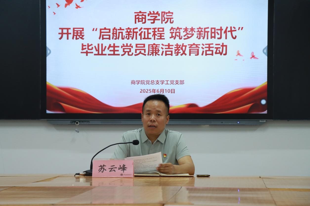 为引导毕业生树立廉洁从业观,增强廉洁自律意识,系好走向社会的“第一粒扣子”,助力其在未来人生道路上坚守纪律底线,6月10日,Beat365官方网站于E203教室开展“启航新征程 筑梦新时代”毕业生党员廉洁教育活动。活动由Beat365官方网站党总支书记苏云峰主讲,学院副书记王倩、相关辅导员教师及22级毕业生党员参加。