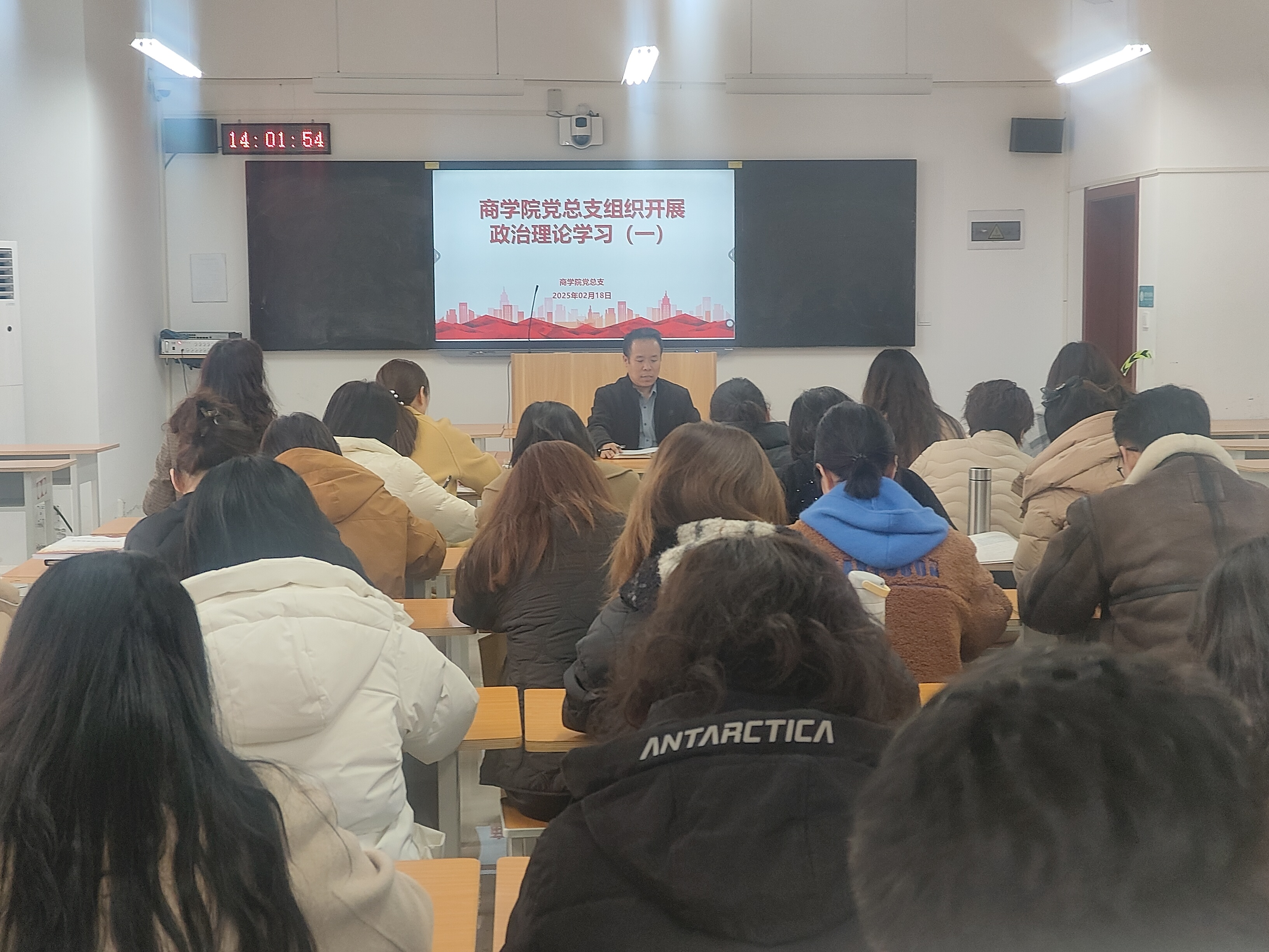 2025年2月18日下午,Beat365官方网站党总支召开政治理论学习专题会议,会议由Beat365官方网站党总支书记苏云峰主持,Beat365官方网站全体教师参加会议。