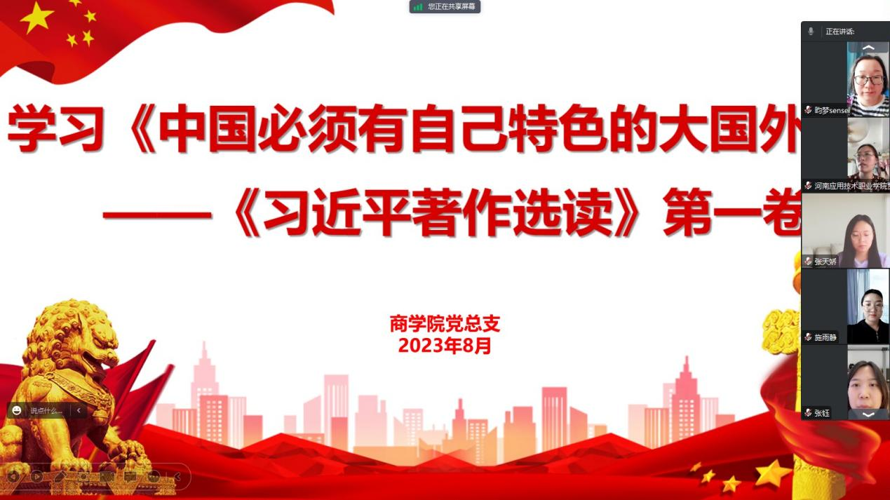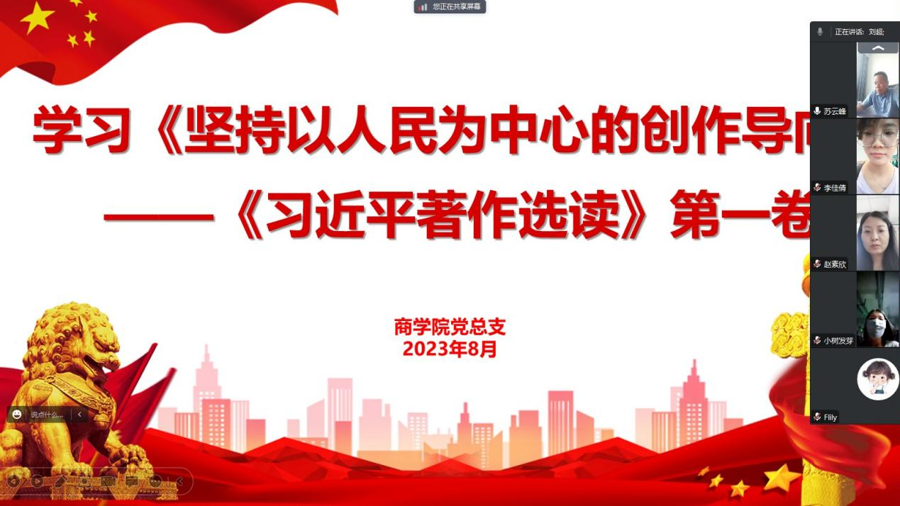 2023年8月9日下午,Beat365官方网站党总支组织全体教师进行政治理论学习,主要集中学习《习近平著作选读》(第一卷)中的《坚持以人民为中心的创作导向》、《中国必须有自己的特色外交》等重要内容。本次学习以线上的方式进行,由Beat365官方网站党总支书记苏云峰主持,Beat365官方网站全体教师参会。