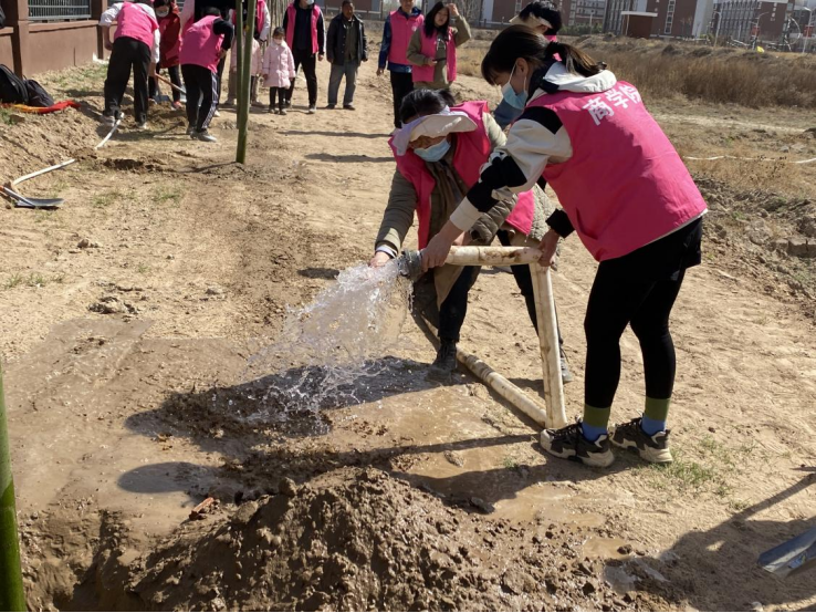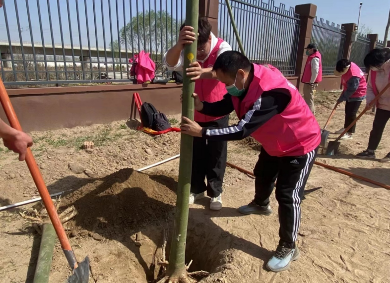 植树活动现场,师生志愿者们分为若干小队分扛树苗、发铁锨、搬水管大家充分发挥团结、互助的精神,明确分工、紧密合作。挖坑、栽植、回填、覆土、保墒、浇水等步骤有条不紊地进行着。党总支书记苏云峰、副书记王倩带着师生们一起为树浇灌,不畏辛苦,最终在大家的共同努力下,为校园环境增添一抹新绿,师生共同期待来年小树迸发蓬勃生机。
