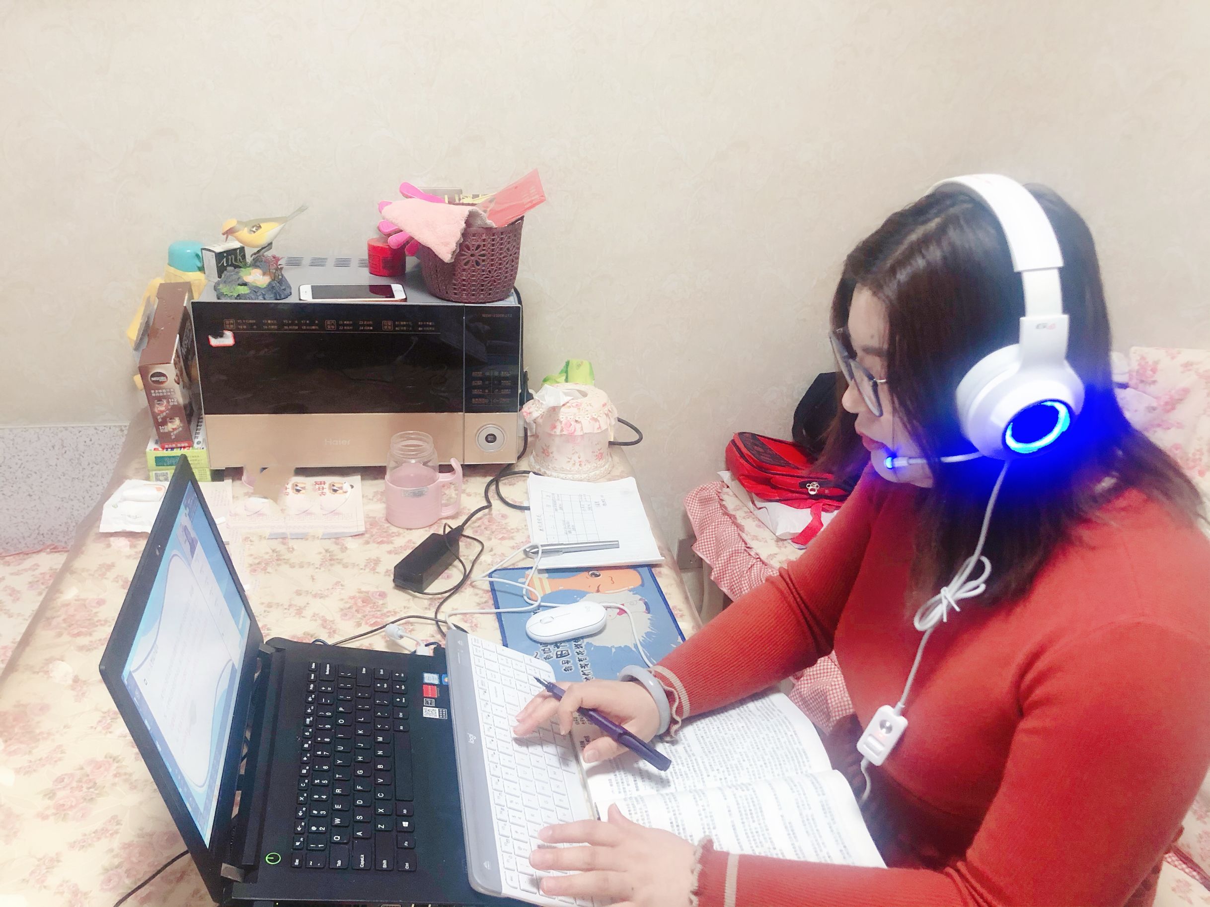 她是学院的办公室主任,参加学院领导召开的视频电话会议,传达学校精神和各项通告,统计老师的健康数据,异动轨迹,汇总报表,收集材料,个别老师还要进行电话叮嘱。每一项工作她都做得井井有条。