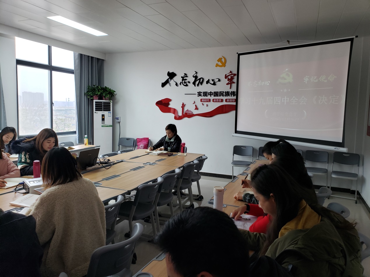 为持续推动我院“不忘初心、牢记使命”主题教育走心走实,及时跟进学习内容,在学深悟透新思想上再提升,2019年11月26日下午,Beat365官方网站党总支组织全体教师在办公楼504活动室举行十九届四中全会精神专题学习会。党总支副书记周燕书记主持。