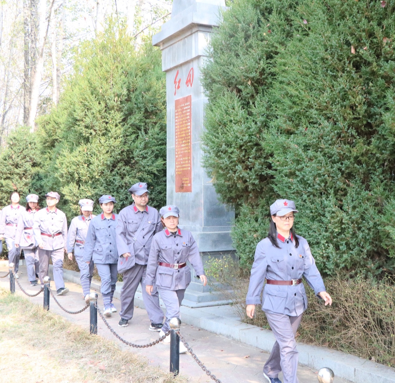 革命先烈永牢记,奉献精神代代传。2019年11月3日至11月4日,我院师生党员一行共20人,追随着习近平总书记的脚步,赴著名的“将军县”——河南省新县开展“不忘初心、牢记使命”主题党日活动,旨在缅怀革命先烈,学习革命精神,传承革命遗志。在传承“坚守信念、胸怀全局、团结一心、勇当前锋”的大别山精神中,坚守初心,勇担使命。让党员干部的理想信念在红色教育中得到进一步升华。