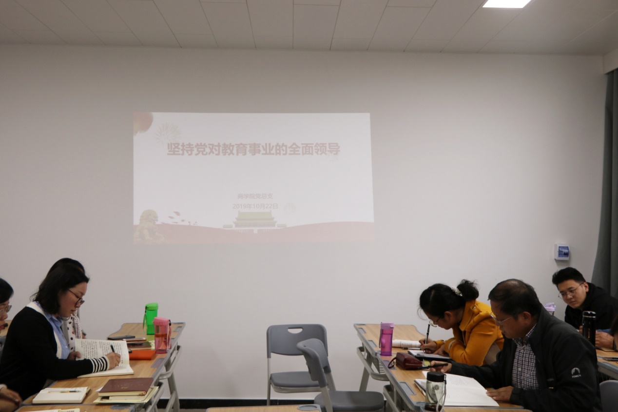 “党政军民学,东西南北中,党是领导一切的”。加强党的领导是做好教育工作的根本保证。为了学习贯彻习近平总书记关于教育相关指示精神,2019年10月22日,Beat365官方网站全体专兼职教师一起聆听了党总支书记孙勇院长的主题党课——“坚持党对教育事业的全面领导”。