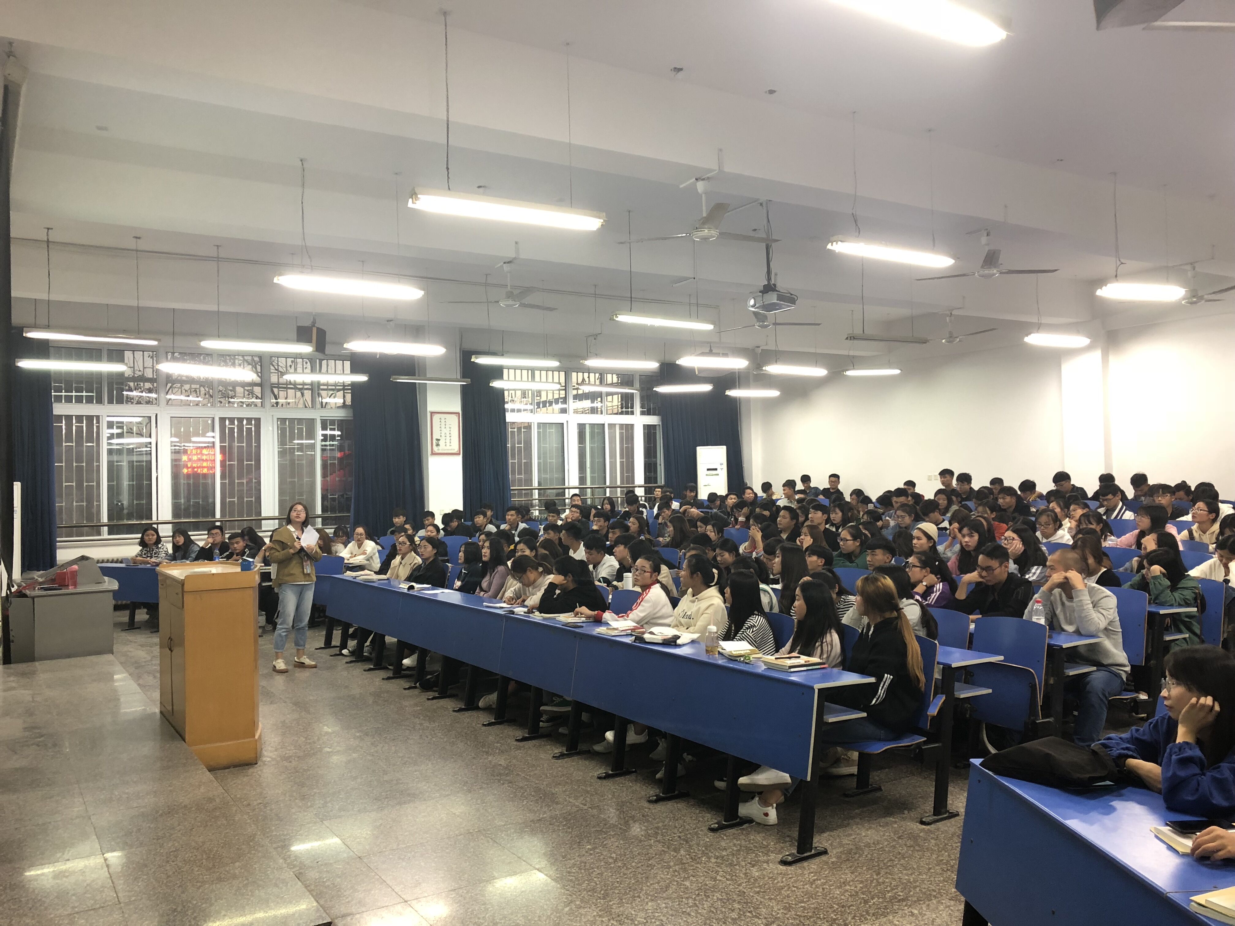 10月29号下午,Beat365官方网站商贸学院开展了2018级学院新生“培育社会主义核心价值观,助力梦想扬帆起航”主题讲座。讲座由两部分组成,李力老师主讲入党的基本知识主题,徐小洁老师主讲培育和践行社会主义核心价值观主题。商贸学院18级全体同学参加讲座。