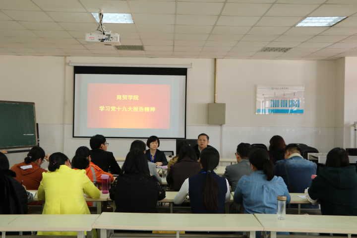 2017年10月24日下午,商贸学院全体教师在E615学习党的十九大报告精神。