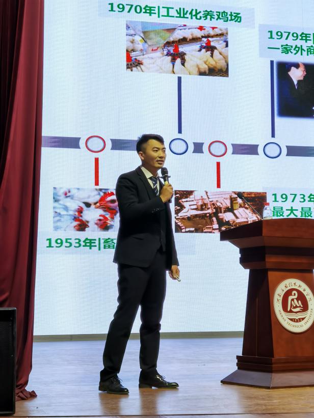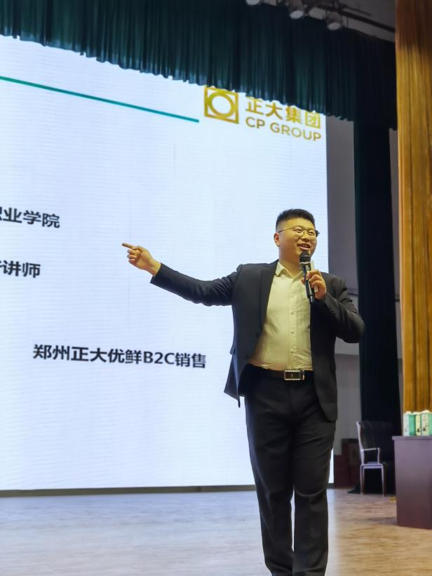 正大集团郑州零售事业招聘主管高俊鹏向同学们进行招聘宣讲。他介绍了正大集团的发展历程、企业愿景、农牧食品事业全产业链及企业文化,强调公司对订单班的学生制定了一套完备的培训计划,为同学们的发展提供好的平台。此外,他向大家介绍了“正大班”的福利待遇及发展道路。