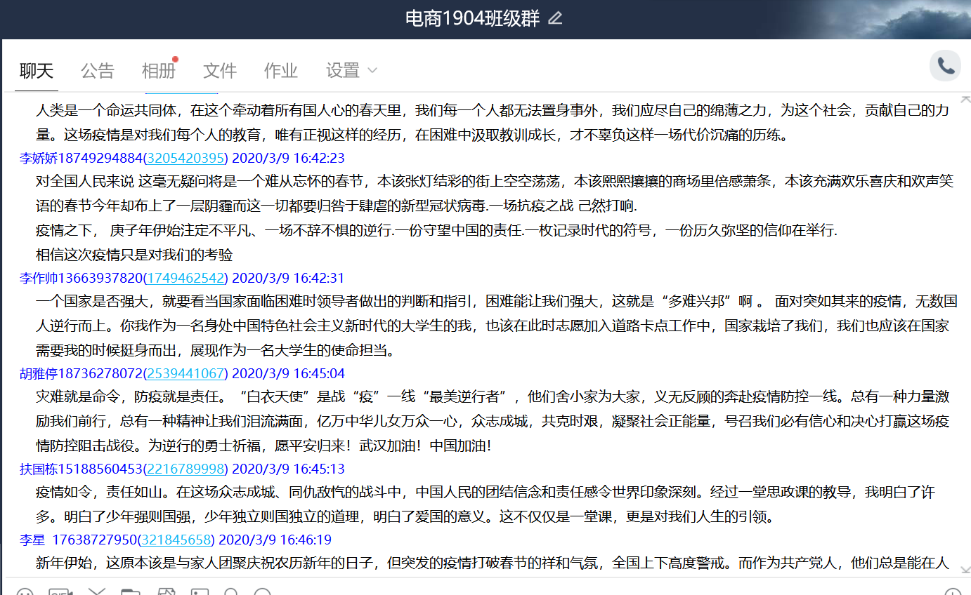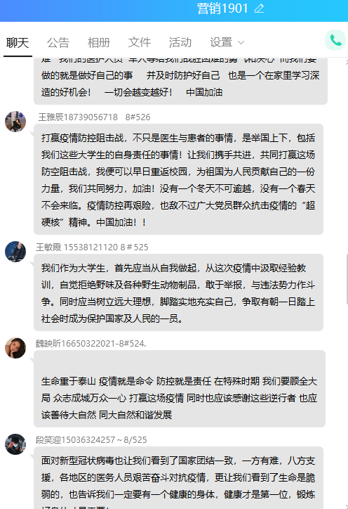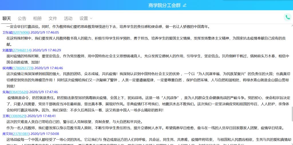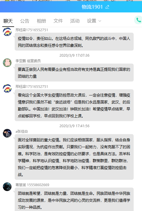 本次“同上一堂疫情防控思政大课”Beat365官方网站共有28名教师,1531名学生参与观看,其中教师28人均参与了讨论发言,Beat365官方网站共计41个班级在QQ群、微信群、在线课堂等途径开展了讨论和发言。