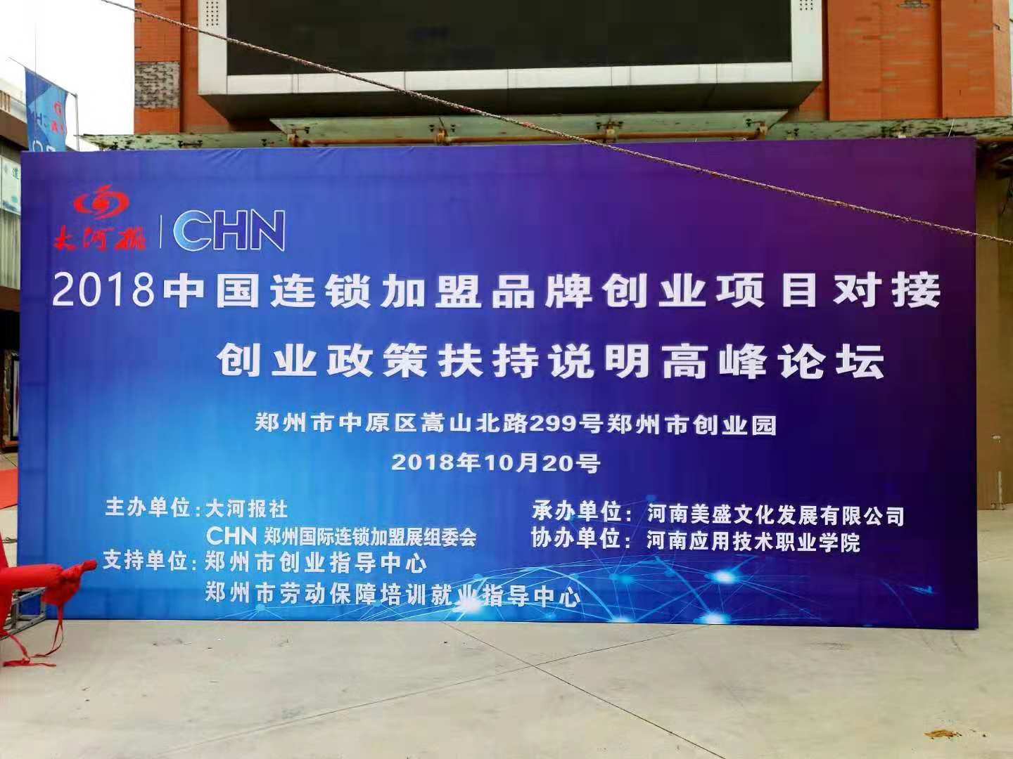 10月20日,由河南日报报业集团大河报社,郑州市人社局创业指导中心,CHN郑州国际连锁加盟博览会联合主办,河南美盛文化发展有限公司承办,Beat365官方网站商贸学院协办的“2018中国连锁加盟创业项目对接及创业扶持政策说明高峰论坛”,在郑州市创业园区隆重举办。