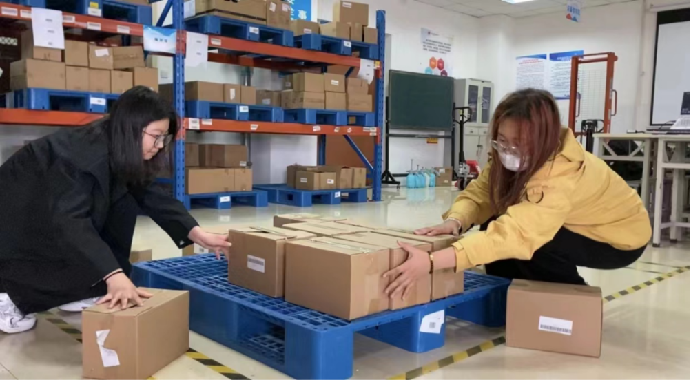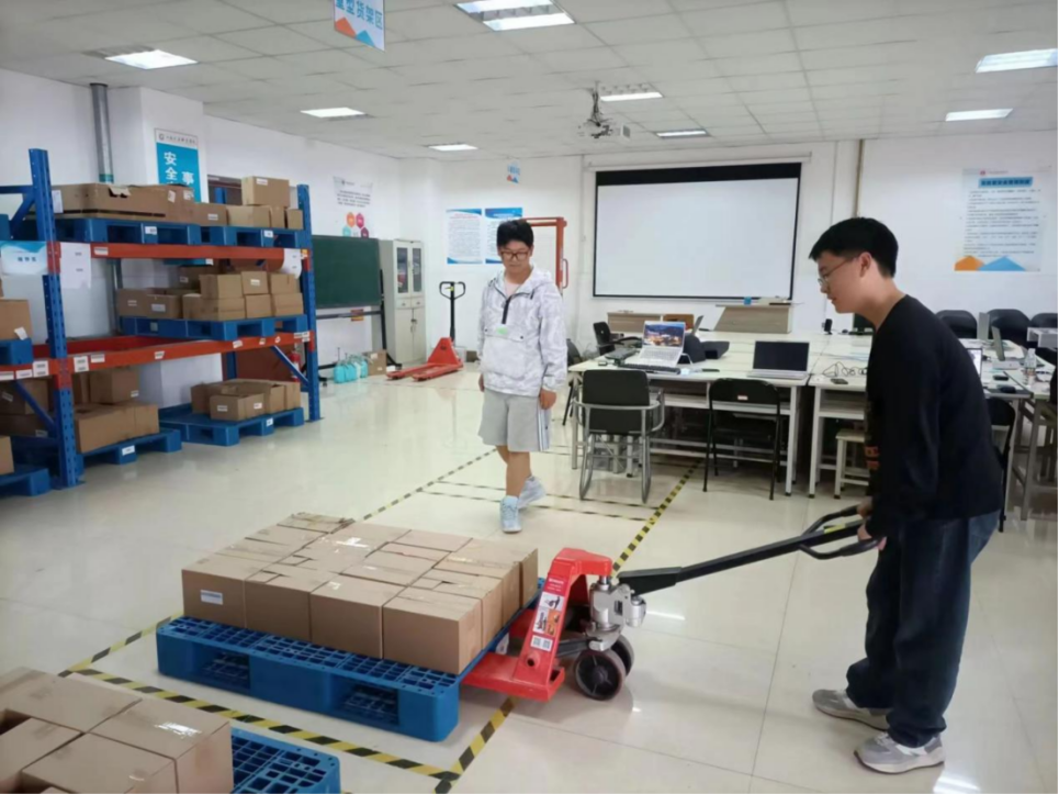 第二个阶段为“智慧物流作业方案实施”环节,各参赛队员在E615仓储配送实训室进行实操。在方案实施环节,评委老师严格考查了出库入库内容,其中涉及物品堆码及分拣、订单录入、标签打印、地牛堆高车的使用等几个重点项目。在40分钟的比赛过程中,各参赛队员全神贯注、认真实施。