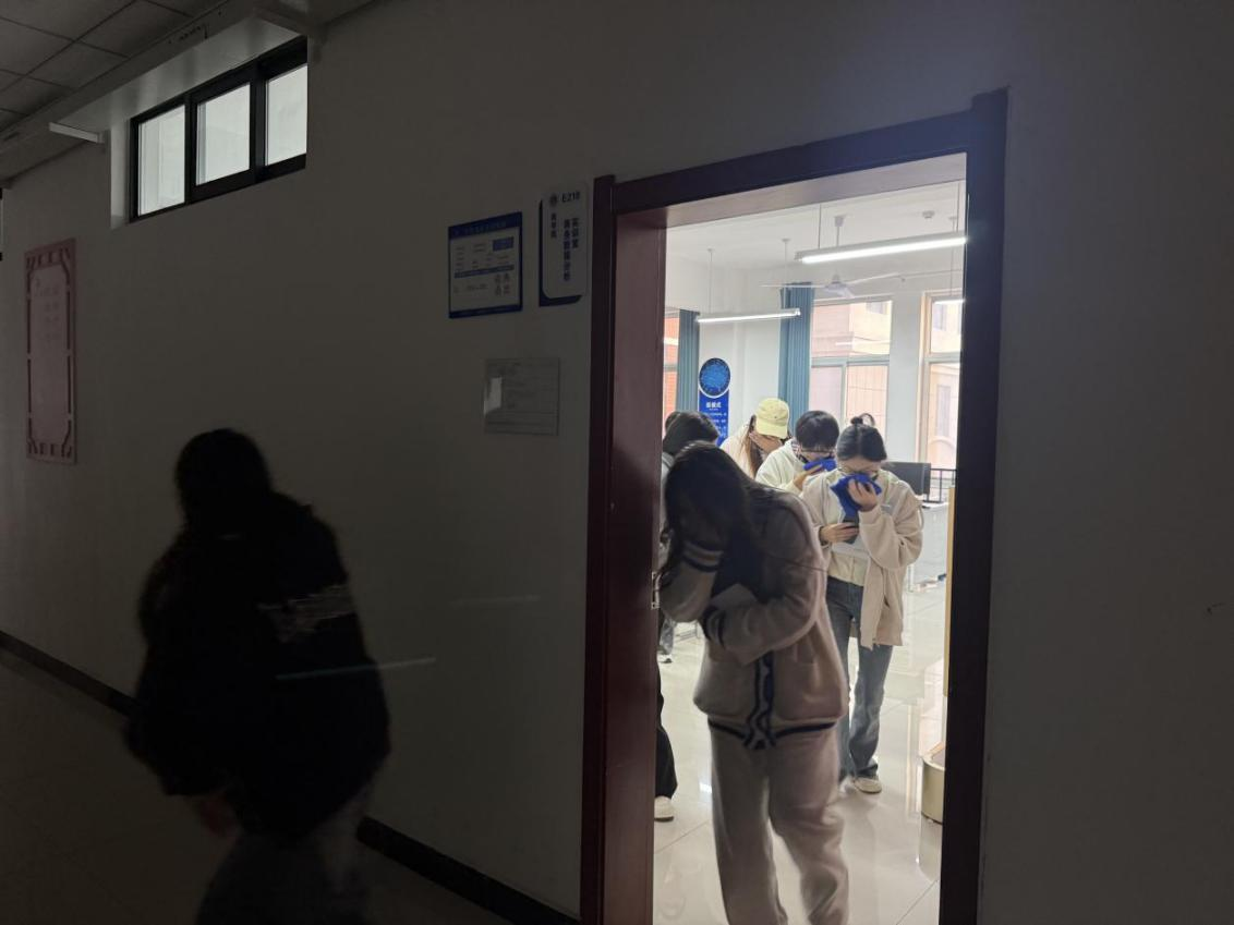 此次演练以实训室“线路短路起火”为场景,学生在教师的指导下快速响应,按照“低腰、湿毛巾捂住口鼻”的逃生要领,沿着预设安全通道快速撤离,全程保持安静有序,顺利抵达楼前安全空旷区域,完成疏散集结。
