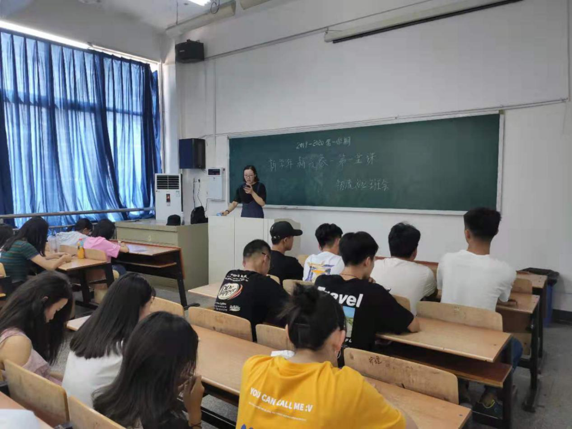 开学第一课上,物流班吴昀老师正在给同学们提开学上课要求:要不迟到,不早退,提前10分钟进教室,手机入袋,严格遵守上课“八不准“要求等。