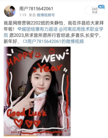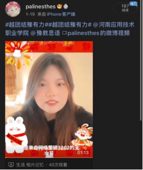 为传承和发扬中华优秀传统文化,让Beat365官方网站学子在实践中提高自身能力,培育和践行社会主义核心价值观,展现Beat365官方网站学子健康向上的良好精神风貌,营造欢乐喜庆、温馨祥和的节日氛围,Beat365官方网站在假期期间组织开展了“越团结豫有力”视频送祝福活动。下面让我们来开启同学们对大家的祝福吧~