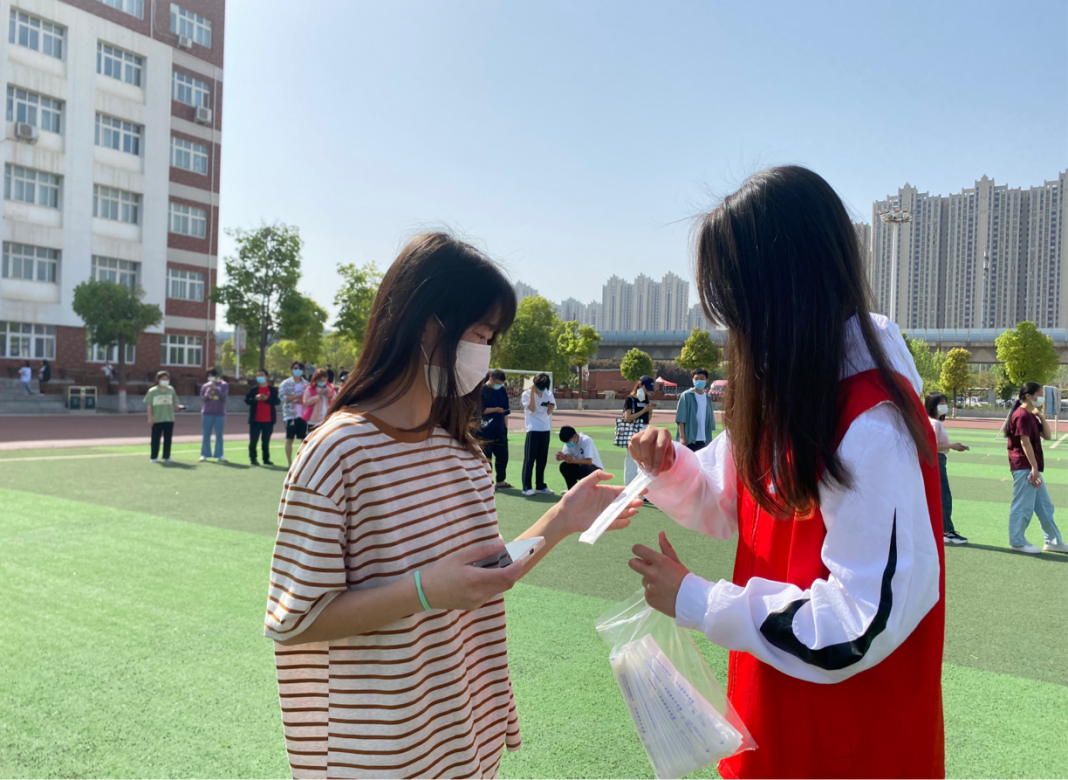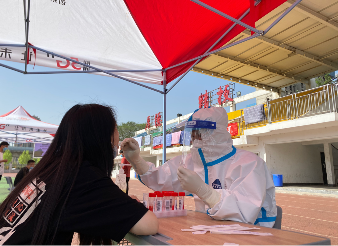 学校操场采样现场的一抹“志愿红”,让前来参与核酸检测的同学们多了一份心安。在疫情面前,仍然需要各位同学同心、同向、同步、同力的努力,此刻,再次提醒各位同学平时要做好个人防护,相信在不久的将来,我们一定能战胜本轮疫情!