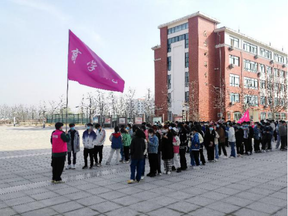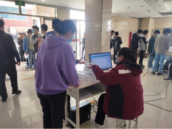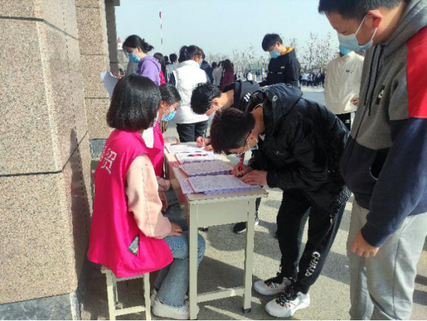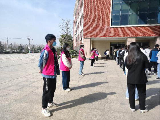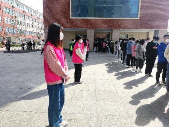 志愿者们维持现场秩序,提醒同学们保持一米间隔