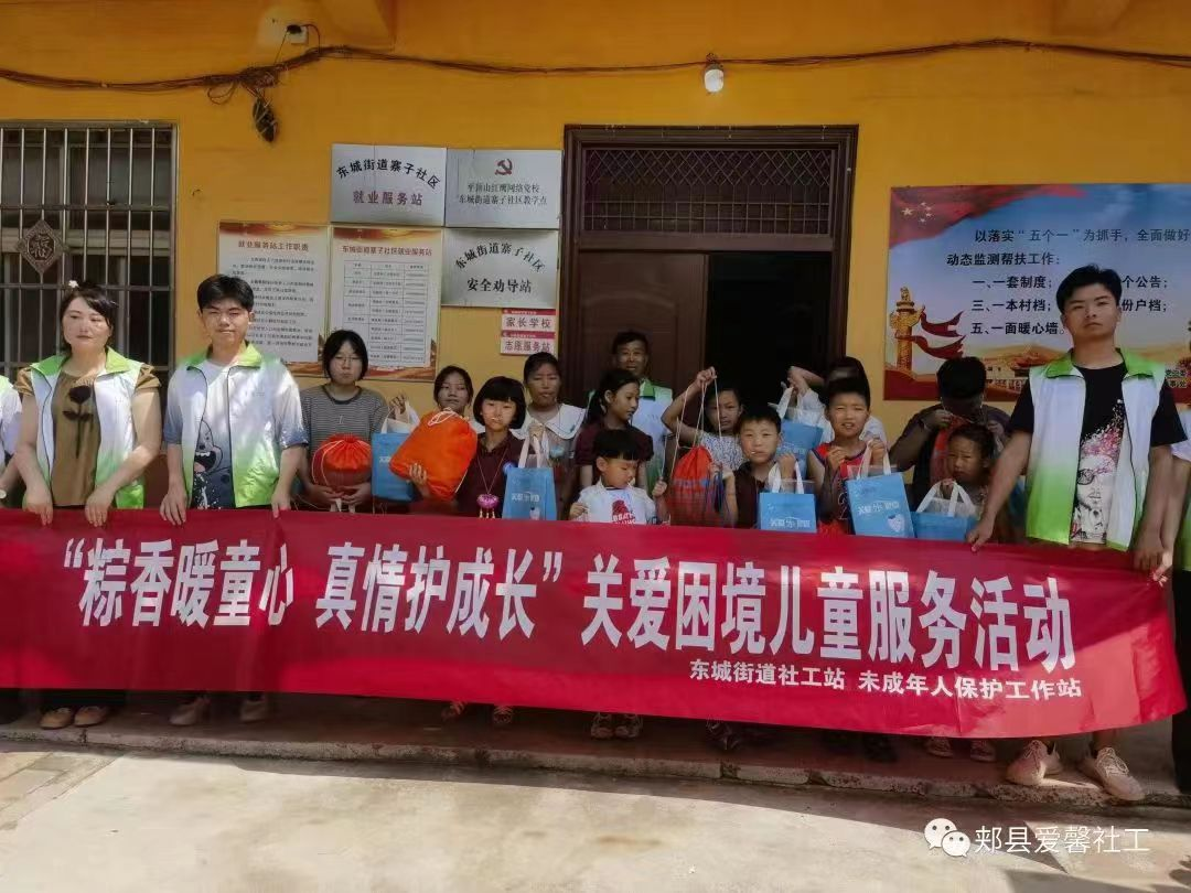 :6月18日至今,参加了平顶山市郏县爱馨社工的暑期实践活动。五月初五端午节在东城街道寨子社区开展志愿者“粽香暖童心 真情护成长”端午节关爱困境儿童送关怀活动。