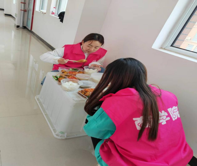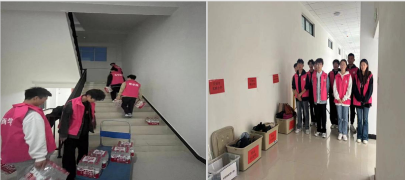 志愿者们在校门口迎接客校教师进入休息室后,6点50分,进行早餐分发工作,7点发放完毕,监考老师进入考场后,志愿者们完成休息室卫生清扫、饮用水和抽纸摆放等工作任务。中午12:00准时领取午餐并进行分发和派送,保障每名监考教师和场内工作人员及时用餐。