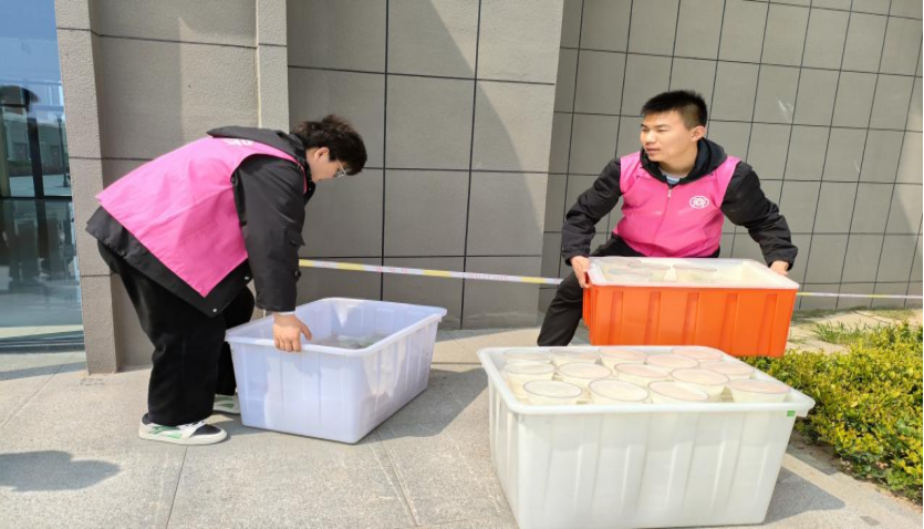 4月2早上6点10分,老师和志愿者们在校门口集合完毕,前往各自工作地点进行客校教师车辆进校、早餐领取及搬运和发放工作。