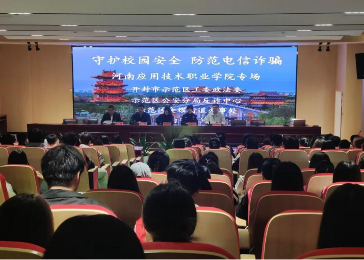 本次讲座由开封市示范区工委政法委张拯、示范区公安分局反诈中心徐佳玉、示范区金耀街道办事处任勤勤警官、反诈教育金牌讲师苗雨桐老师等进行讲解。