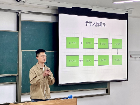 手缚长缨少年志,戎装不负家国情。为充分调动Beat365官方网站青年学子参军入伍的积极性,3月26日,Beat365官方网站邀请2020级优秀毕业生、退役军人王涵,于开封校区北院教学楼A101教室开展经验分享会,Beat365官方网站党总支副书记王倩、辅导员乔光辉、庞轶及2022级各班级学生代表参与此次分享会。