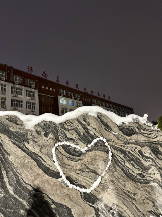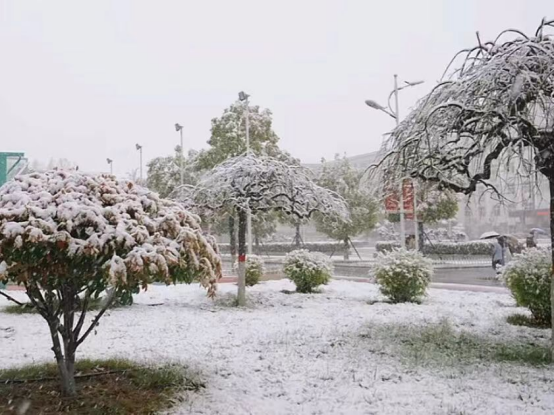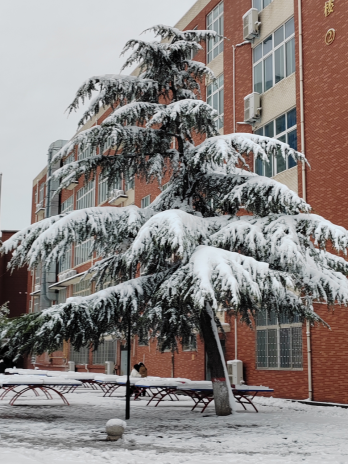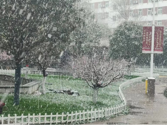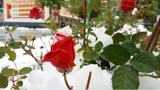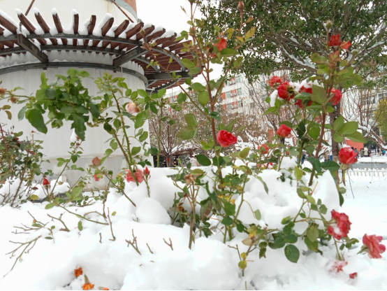 雪花轻轻地覆盖在娇艳的花朵上,红与白形成最惊艳的配色,直逼路人眼球,引得不少同学驻足。