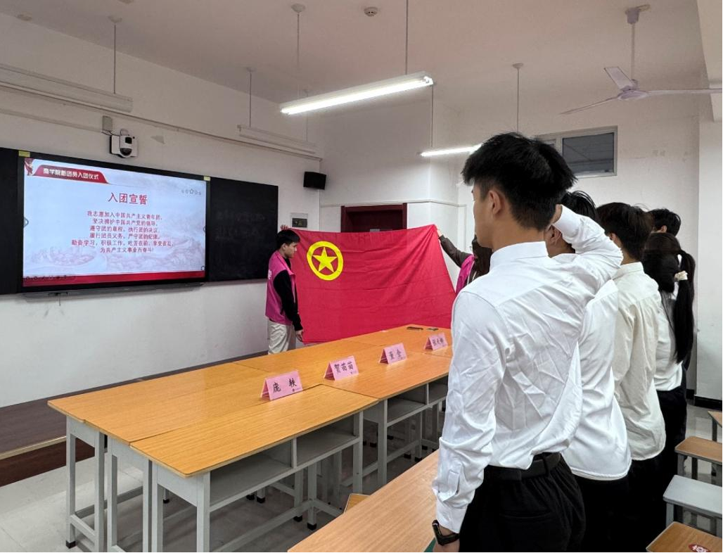 全体起立面向团旗立正,举起右手并握拳,与右耳齐,拳心向前。领誓人黄莉媛带领现场团员进行宣誓。