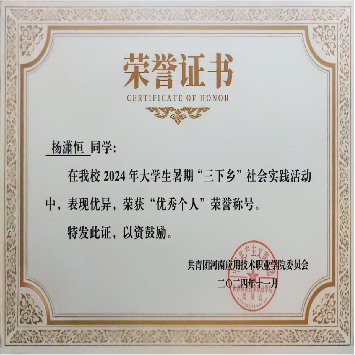 杨潇恒始终秉持“知行合一,服务社会”的信念,在刻苦钻研专业知识的同时,积极投身于各类社会实践与志愿服务活动中,努力实现自我价值的升华。他积极参与福利院志愿服务,用实际行动传递温暖。在活动前,他会提前了解相关内容。在到达福利院后,给孩子们讲故事,带领他们做简单的非遗烧箔画,陪他们聊天,缓解他们的孤单情绪。那一次,福利院的小男孩因情绪低落,他坐在他身边,给他剥瓜子,耐心陪他聊天,逐渐帮他平复心情。活动结束时,主动邀请本人进行合照,这让本人深刻感受到志愿服务的意义。这段经历不仅让他学会了倾听与关怀,更让他明白微小的行动也能为他人带来力量。在实践活动方面,他还参加了暑期三下乡实践活动,虽然汗水浸湿了衣背但真正做到了“脚下沾满泥土,心中沉淀真情”。在实践结束后,他们结合专业知识,提出了利用短视频平台直播带货、设计特色包装等具体建议。从这次“三下乡”让他褪去了大学生的“书生气”,接上了农村的“地气”。他不仅将理论知识应用于实践,更真切感受到了中国乡村的脉搏。这段经历锻炼了他吃苦耐劳的精神、团队协作能力和解决实际问题的思维,是人生中一笔宝贵的财富,也增强了他作为公民的社会责任感。