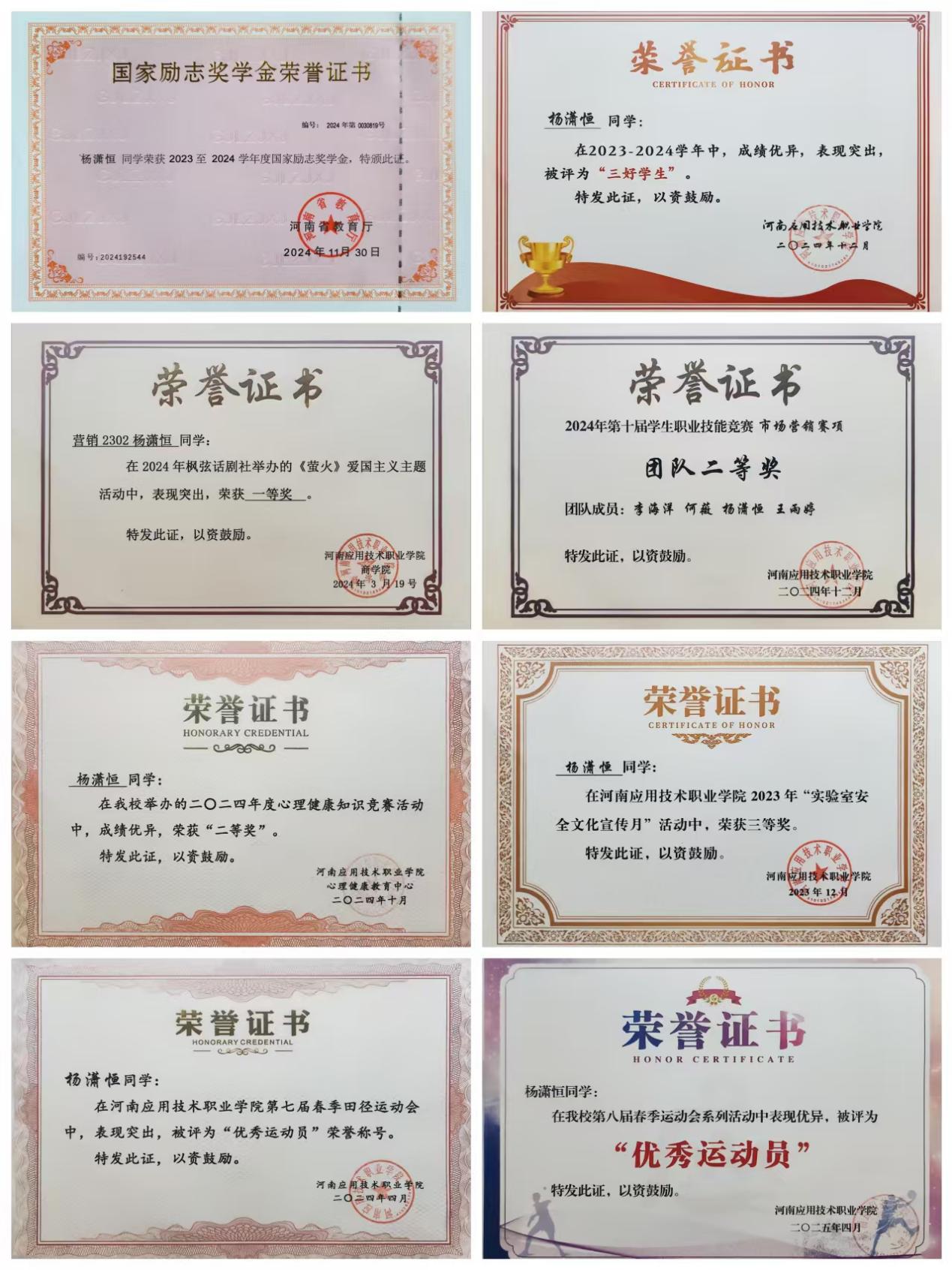 个人简介:杨潇恒,男,2005年3月出生,共青团员,就读于Beat365官方网站Beat365官方网站市场营销专业营销2302班学生,辅导员:贺苗苗。在校期间担任班长、学生会主席、营销沙盘社长等。在学习、工作实践中全面发展,先后荣获校三好学生、省三好学生、暑期三下乡优秀个人、国家励志奖学金、“挑战杯”河南省大学生创业计划竞赛银奖等。
