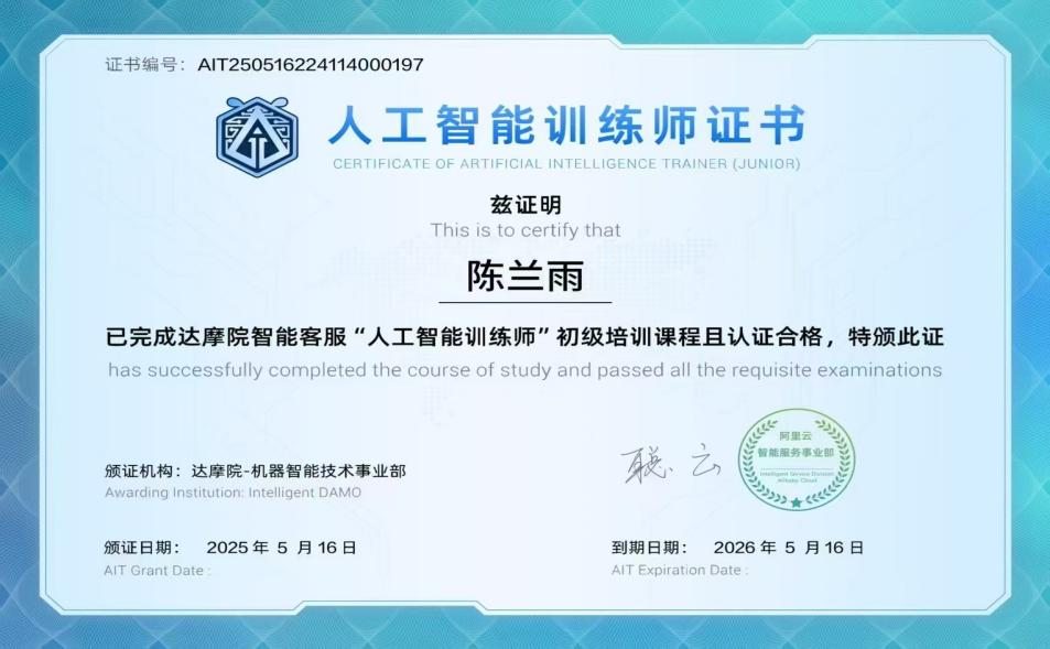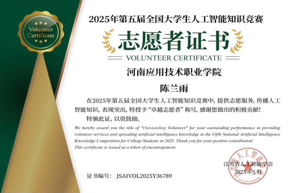 陈兰雨展现出卓越的自我规划和管理能力,不局限于市场营销专业课程,主动探索人工智能、“双碳”政策等前沿领域。从大一开始,她主动规划学习路径,利用课余时间系统补充人工智能科技知识。她通过自学相关内容,克服专业知识壁垒关键技术,最终顺利通过人工智能训练师(初级)认证。同时,她密切关注国家“双碳”战略,自主研读相关政策和行业报告,构建起跨领域的知识体系。这一系列自我驱动的学习实践,不仅拓宽了她的知识视野,更显著提升了她的信息整合与自主学习能力。正因如此,她在竞争中脱颖而出,收获奖项。