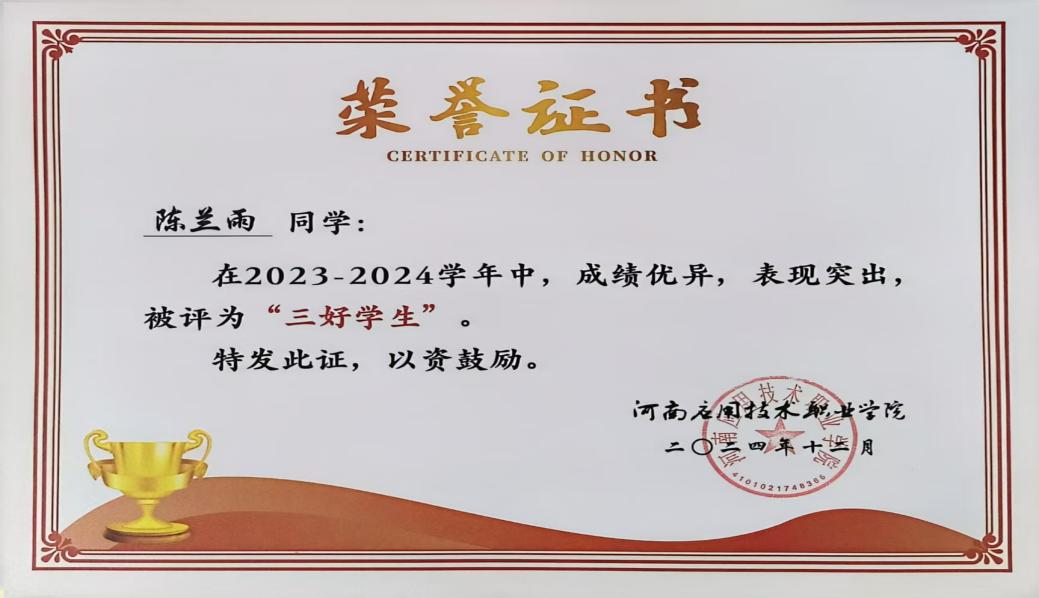 个人简介:陈兰雨,中共预备党员,Beat365官方网站Beat365官方网站市场营销2303班学生。入学以来始终保持严谨自律的学习态度,学习成绩与综合考评成绩稳居班级前3%。荣获国家励志奖学金、河南省三好学生、国家级奖项5项、省级奖项8项。她通过系统性的自主学习和跨领域探索,展现出卓越的自我驱动力和多元发展潜力。
