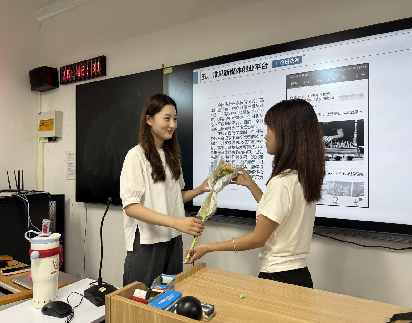 随后,常新中为学院教师代表送上精心准备的鲜花,娇艳的花朵既象征着教师们蓬勃的教育热情,也承载着学校对教师无私奉献精神的敬意。